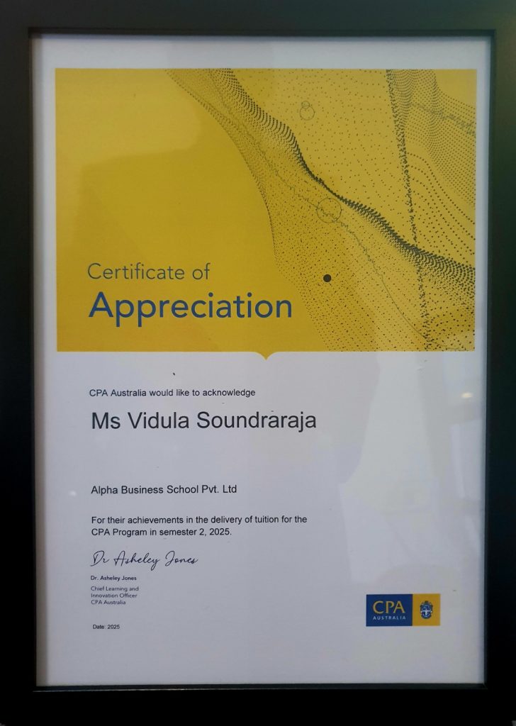 As the only Registered Tuition Provider for the CPA Australia qualification in Sri Lanka, Alpha Business School continues to set a benchmark in professional accounting education. The outstanding results achieved by its students reflect the institution’s strong academic support, structured learning approach, and commitment to student success.